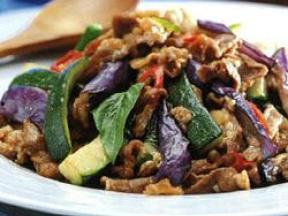 4. 茄瓜炒肉片:将腌制好的茄瓜条放入锅中翻炒,加入肉片、蒜末、姜末、生抽、老抽、盐、糖、鸡精等调味料,翻炒均匀即可。